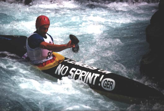 Der Sprint wurde in unserer Sportart zum ersten Mal 1993 in einem World Cup Rennen ausgetragen. Mittlerweile gehört der Sprint auch zum festen Bestandteil unseres nationalen Wettkampfkalenders. Es ist nun schon zuviel Zeit vergangen, um den grössten Einschnitt in unsere Sportart unreflektiert zu lassen. Beginnen wir mit einem Rückblick, in dem wir die Abläufe beleuchten, die den Sprint zu einem von der ICF abgesegnetem Bestandteil unseres Wettkampfsaison machten. Von Anfang an lag das Motiv Sprintrennen auszurichten darin, das Produkt Wildwasserrennen besser zu vermarkten und den Einzug ins olympische Programm zu erreichen. Die Franzosen leisteten die grösste Lobbyarbeit und richteten 1991 auf der Isere den ersten gross aufgezogenen Sprintwettkampf aus. Preisgeld, Discomusik auf der Strecke und gratis Speiseeis bis zum Abwinken waren Reize, denen man schnell erliegen konnte.Es wurden damals Parallelsprints gefahren. D.h. zwei Boote starteten gleichzeitig gegeneinander in zwei Läufen. Die Zeiten wurden addiert und nach dem KO- Prinzip kam der Bessere eine Runde weiter. Ich kann mir leider nicht verkneifen zu erwähnen, dass ich mit den 3000 Franc nach Hause fuhr. Auf der Isere wurde knapp 15m versetzt gestartet und jeder musste einmal hinten starten.