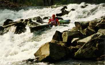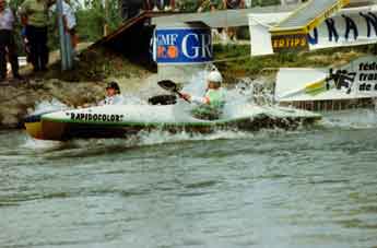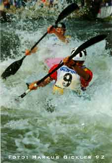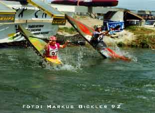 Im darauf folgendem Jahr wurde auf einem Slalomkanal der Rhone ein Art des Startes gefunden, der noch mehr Spektakel versprach. Dieses Ziel wurde voll erreicht und führte dazu, dass keine Parallelsprints mehr stattfanden. Die Startmaschine bestand aus einem Podest, dass in zwei Metern Höhe auf einer Brücke montiert war. Auf diesem Podest waren als Wippe zwei Paketrutschen befestigt, die mit einem Startsystem gelöst werden konnten. Man rutschte dann beim Start in etwa gleichzeitig ins Wasser. Leider war der Start nicht sehr dynamisch, weil alle Boote komplett abtauchten und so die Energie der Startrutsche verpuffte. Das führte nebenbei bemerkt zu sehr interessanten Beobachtungen darüber, welche Kajaks schnell wieder auftauchten. Das ist zwar eine ganz andere Geschichte, das Ergebnis aber wissenswert. Kajaks die flache Oberschiffe hatten, nicht sehr steif waren und in denen schwere Paddler sassen, tauchten mit Abstand am schlechtesten auf. Das alles traf auf mich und meinem Savage 100% zu. Diese Erkenntnis reifte dann zu einem neu gestalteten Oberschiff für die Saison 93. Bis heute bin ich dem Veranstalter dankbar für den grössten Kajaktest, den es je gegeben hat. Doch zurück zum Wettkampf: Der Startaufbau führte unweigerlich dazu, dass in etwa gleich schnelle Paddler miteinander kollidierten. Manche schon beim Auftauchen, den meisten passierte es beim Einfahren in den ersten Schwall. Es gab unterschiedliche Ansätze mit diesem Problem umzugehen. Um nicht als Verlierer aus dem Zusammenstoss hervorzugehen, konnte man sich am anderen Boot nach vorne ziehen. Oder man wählte die Variante, dem Gegner das Paddel auf die Brust zu setzen und und ihn so nach hinten zu drücken. Um einen solch unfairen Versuch der Vorteilsname abzuwehren, blieb dem Benachteiligten nichts weiter übrig, als ebenfalls unmittelbar zuzugreifen. Oder im weiteren Rennverlauf dem Gegner gezielt und kraftvoll ins Heck zu fahren um wiederum in Führung zu gelangen. Diese ungewohnten Stresssituationen führten zum Teil zu recht drastischen Handgreiflichkeiten auf dem Wasser und an Land. Im CII wurde sich mit dem Paddel geschlagen und im KI legten zwei französische Top- Fahrerinnen den Grundstein für eine leidenschaftliche Feindschaft. Kurz gesagt, der Wildwassersport war auf dem besten Wege eine Kampfsportart zu werden. Doch sank bei der Flut dieser vielen telegenen Bildern doch der Mut, den Schritt zu der totalen Kommerzialisierung zu wagen. Ich muss bis heute dieses inkonsequente Verhalten bedauern, wir hätten damit viel Geld verdienen kšnnen, man denke nur einmal an Sendekonzepte wie American Gladiators!